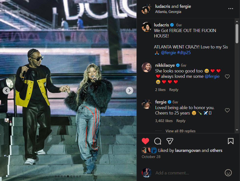 “We Got FERGIE OUT THE F---IN HOUSE!” on his Instagram post from October 28, Ludacris (real name Christian Brian Bridges) shared a video of himself and Fergie performing the famous duet. “ATLANTA WENT CRAZY! Love to my Sis.”