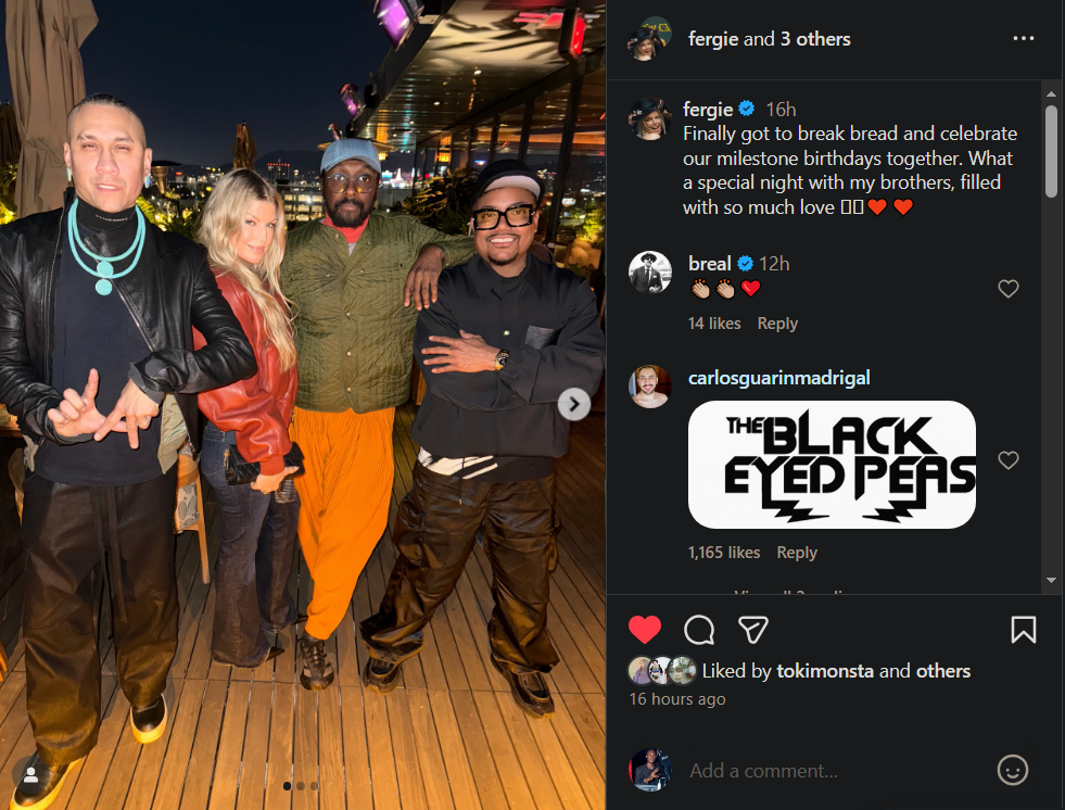 Fans of Black-Eyed Peas deserved a reunion, and Fergie was correct. Eight years after the "Fergalicious" singer's controversial departure, the former bandmates—including Taboo, 50, will.i.am, 50, and APL.DE.AP, 51—got reunited to commemorate their "milestone" birthdays in three incredibly chic photos.