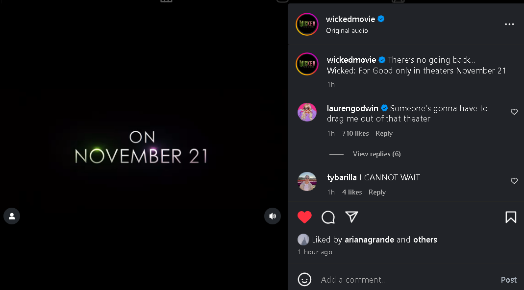 "There’s no turning back... Wicked: For Good only in cinemas November 21" is the caption for an Instagram post that has the official Wicked account announcing the release date along with fan interaction and responses.