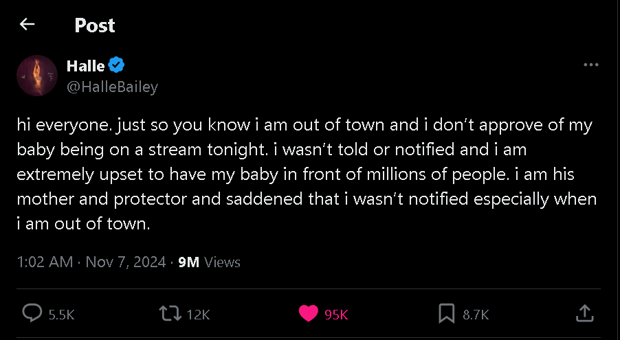 "Hi everyone. just so you know I'm out of town and I don't approve of my baby being on a stream tonight," Halle posted on X, formerly Twitter, after the stream had gone live. "I wasn't told or notified and I'm extremely upset to have my baby in front of millions of people." The 24-year-old also added, "I am his mother and protector and saddened that I wasn't notified especially when I am out of town."
