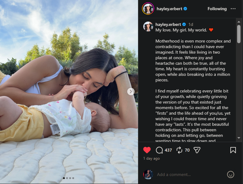“Motherhood is even more complex and contradicting than I could have ever imagined,” on April 10, Hayley posted on Instagram. “It feels like living in two places at once. Where joy and heartache can both be true, all of the time.”