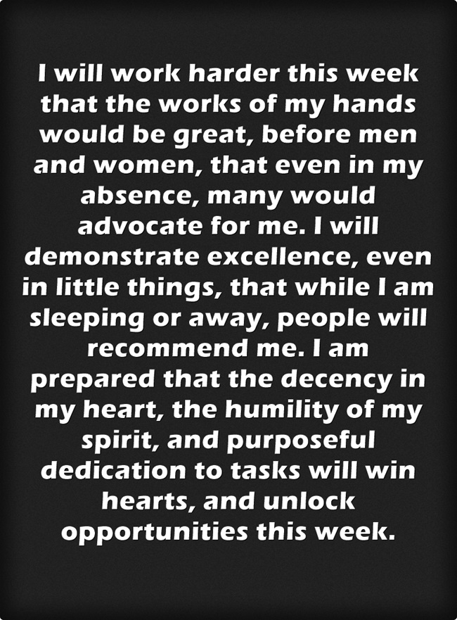 I will work harder this week that the works of my hands would be great, before men and women, that even in my absence, many would advocate for me. I will demonstrate excellence, even in little things, that while I am sleeping or away, people will recommend me. I am prepared that the decency in my heart, the humility of my spirit, and purposeful dedication to tasks will win hearts, and unlock opportunities this week.