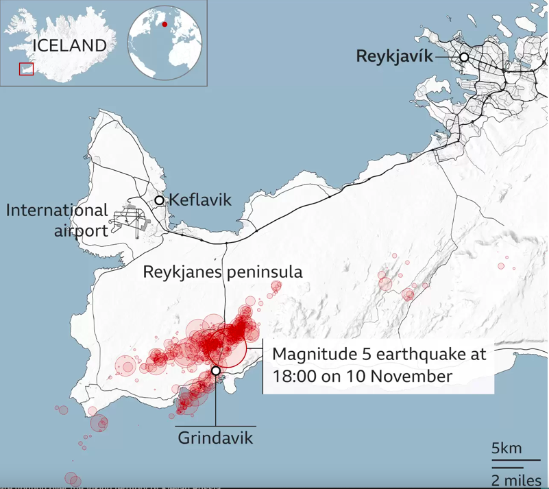 The region around the capital Reykjavik has been experiencing an increase in earthquake activity since late October. The Met Office said that the eruption was located about 4km (2.5 miles) north-east of Grindavik and the seismic activity was moving towards the town.