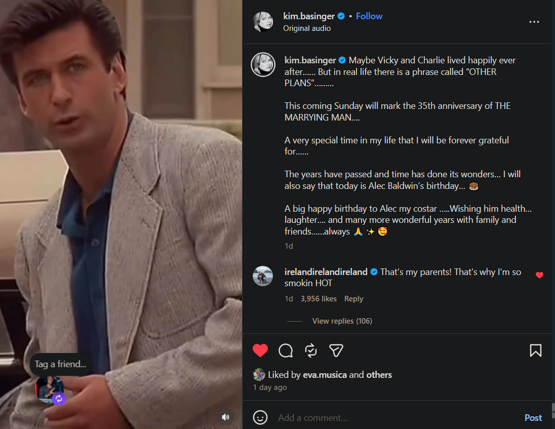 Ireland Baldwin is appreciating what her parents have given her. The model complimented Alec Baldwin on her appearance after her mother Kim Basinger gave him a special birthday shoutout and included a clip from their 1991 film The Marrying Man.