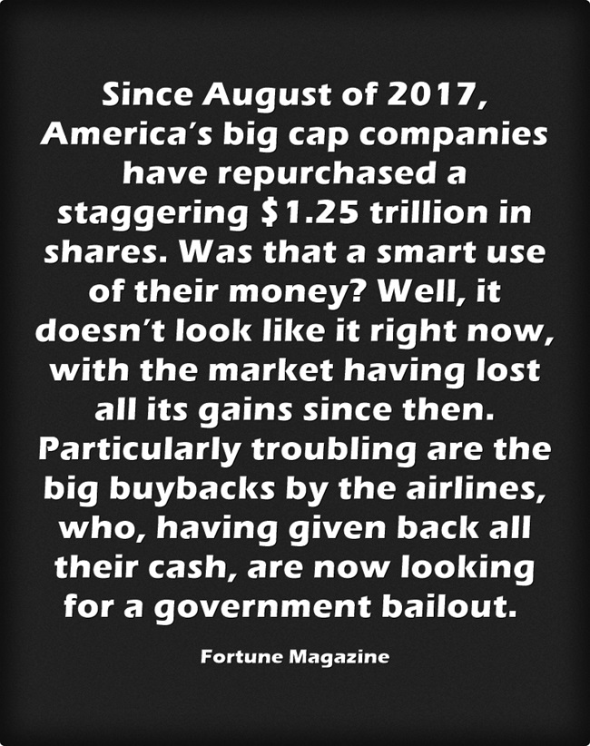 Some will shout that it is privatizing success, but socializing pains. Yet, we need to understand that this time is different! But no matter how you see it, it is part of the system. Yes, "since August of 2017, America’s big cap companies have repurchased a staggering $1.25 trillion in shares. Was that a smart use of their money? Well, it doesn’t look like it right now, with the market having lost all its gains since then. Particularly troubling are the big buybacks by the airlines, who, having given back all their cash, are now looking for a government bailout". Fortune.