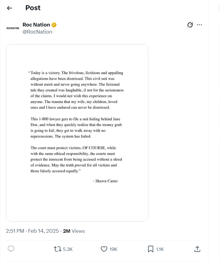While the lawsuit against Jay and Diddy was eventually dropped by the anonymous accuser in February 2025, Jay was vocal with his vehement denial of the charges throughout the process.