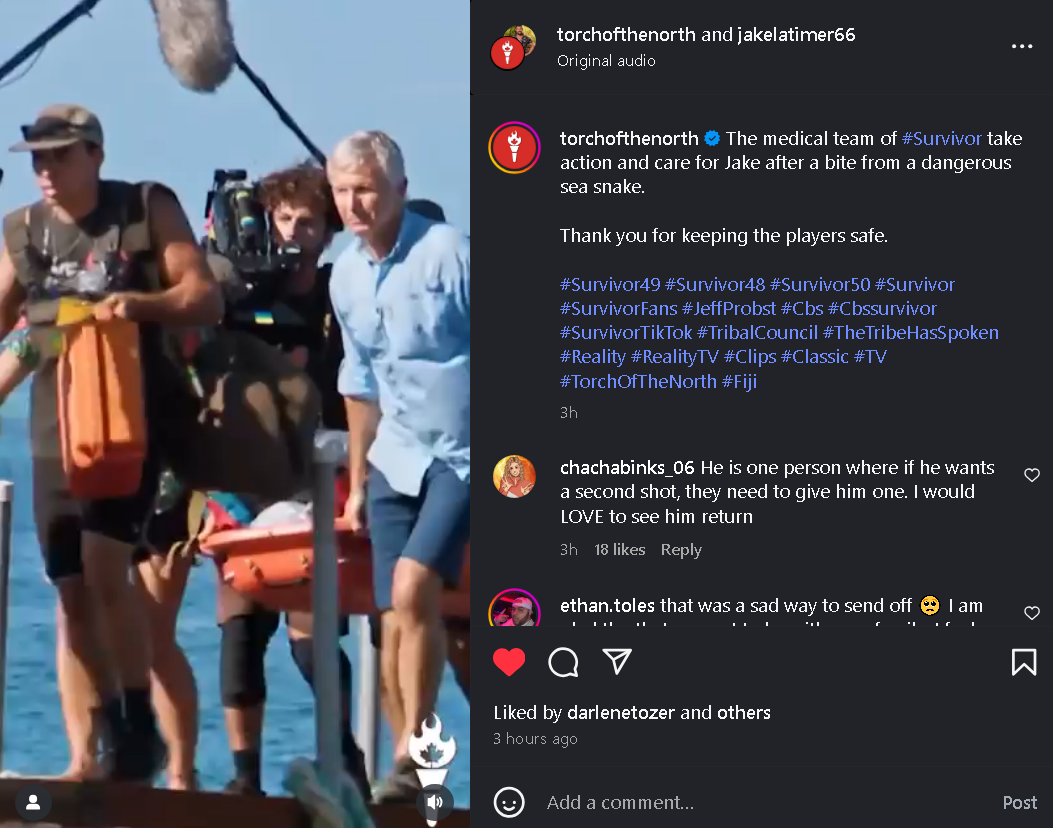 Snakes in the grass are constant problem for survivors. However, the snake in question in season 49 was not a dubious competitor; rather, it was a very real snake, a poisonous sea krait, which bit contender Jake Latimer as he stood in the shallows of the ocean, necessitating his medical evacuation on October 8.