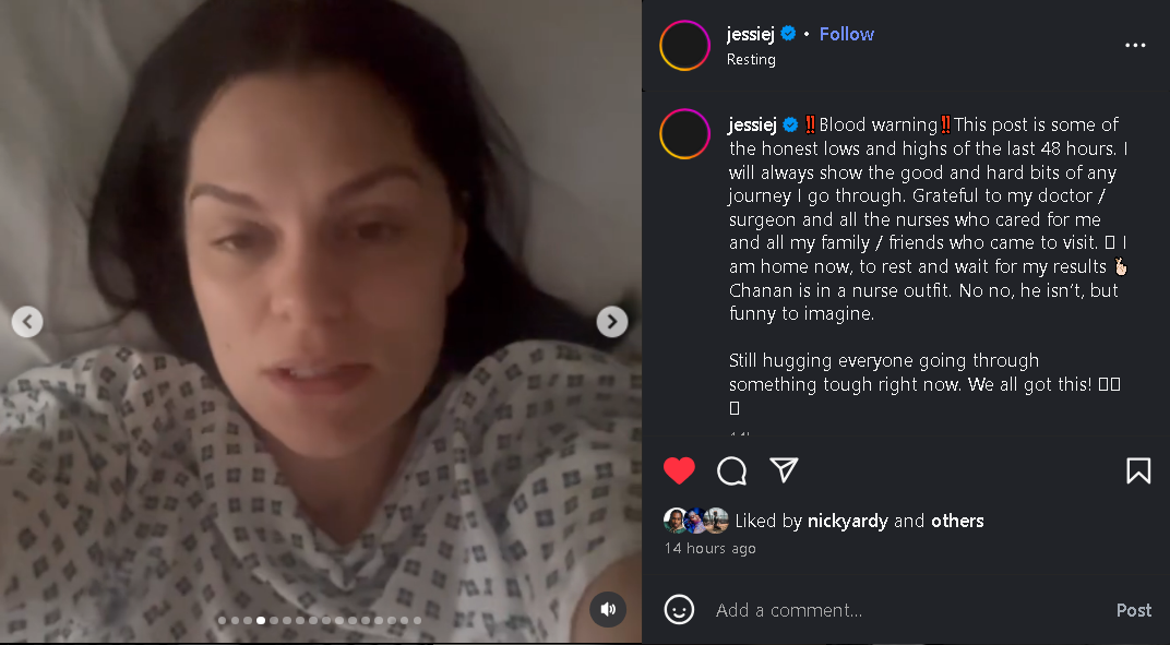 “I will always show the good and hard bits of any journey I go through,” Jessie stated in her caption. “Grateful to my doctor / surgeon and all the nurses who cared for me and all my family / friends who came to visit.”