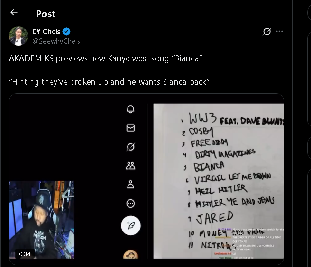 Kanye, whose children with ex-Kim Kardashian are North, 12, Saint, 9, Chicago, 7, and Psalm, 6, dropped a teaser for the song "BIANCA" in April, which seemed to confirm Bianca's separation from him.