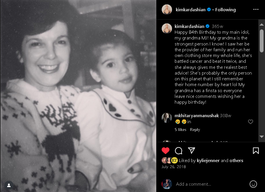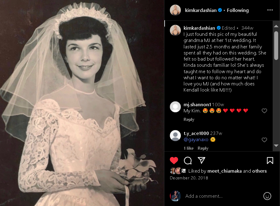 Kim has demonstrated that she is a lot like her grandmother. She even joked that her 2011 72-day marriage to Kris Humphries was a reflection of her grandmother's own two-month marriage. Kim stated in another Instagram post from 2018 that “She felt so bad but followed her heart,” “Kinda sounds familiar lol.”