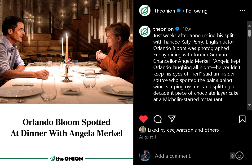 “Just weeks after announcing his split with fiancée Katy Perry, English actor Orlando Bloom was photographed Friday dining with former German Chancellor Angela Merkel,” the Instagram piece from August 1 captions. “’Angela kept Orlando laughing all night—he couldn’t keep his eyes off her!’ said an insider source who spotted the pair sipping wine, slurping oysters, and splitting a decadent piece of chocolate layer cake at a Michelin-starred restaurant.”