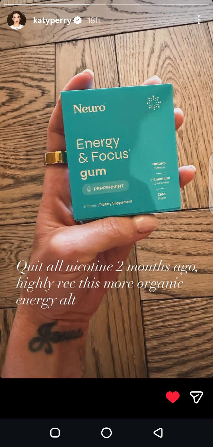 Along with a picture of a bag of peppermint energy and concentration gum, Katy posted the comment, stating that she "highly" suggests the "more organic" energy substitute.