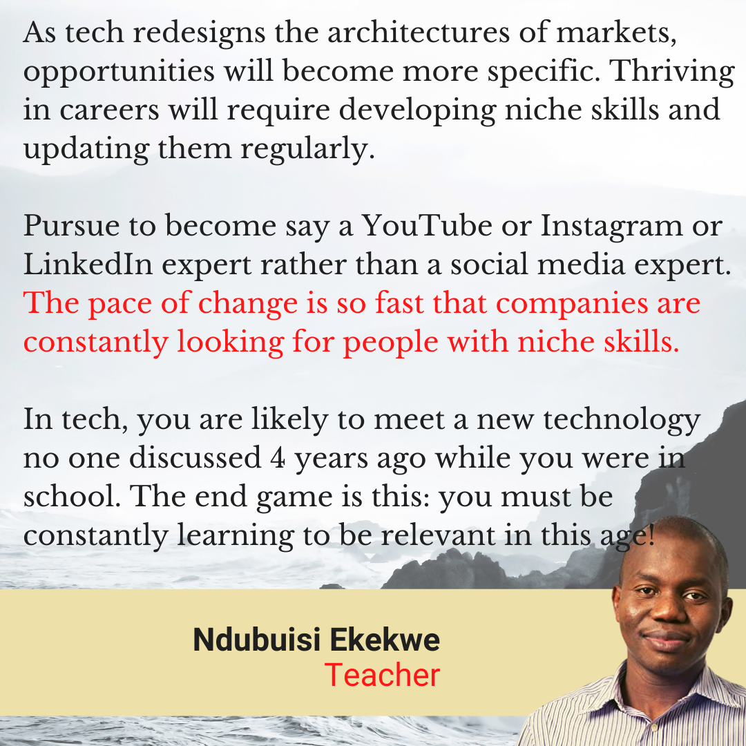 As tech redesigns the architectures of markets, opportunities will become more specific. Thriving in careers will require developing niche skills and updating them regularly.