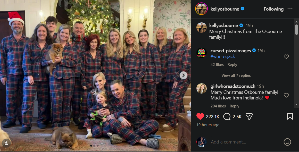 Kelly wrote, "Merry Christmas from The Osbourne family!!!" as the caption for the December 25 Instagram photo.