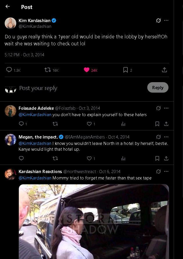 Kim went on, mockingly asking, "Do you guys really think a one-year-old would be inside the lobby by herself?" "Oh, wait she was waiting to check out lol."