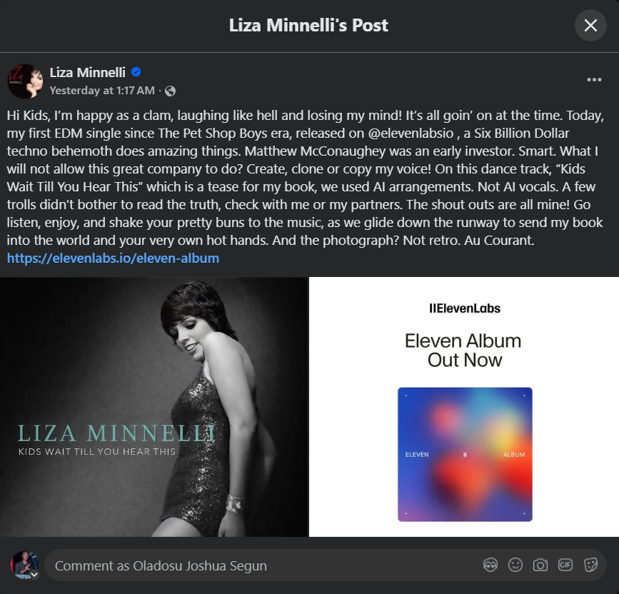 Instead of singing as she usually does, Liza speaks different lines over a techno beat in the dance single "Kids Wait Till You Hear This." The song is one of the 13 pieces on ElevenLabs' most recent album, The Eleven, which also includes singer-pianist Michael Feinstein and Simon & Garfunkel's Art Garfunkel, who, like Liza, combine AI-generated sounds with their characteristic music.