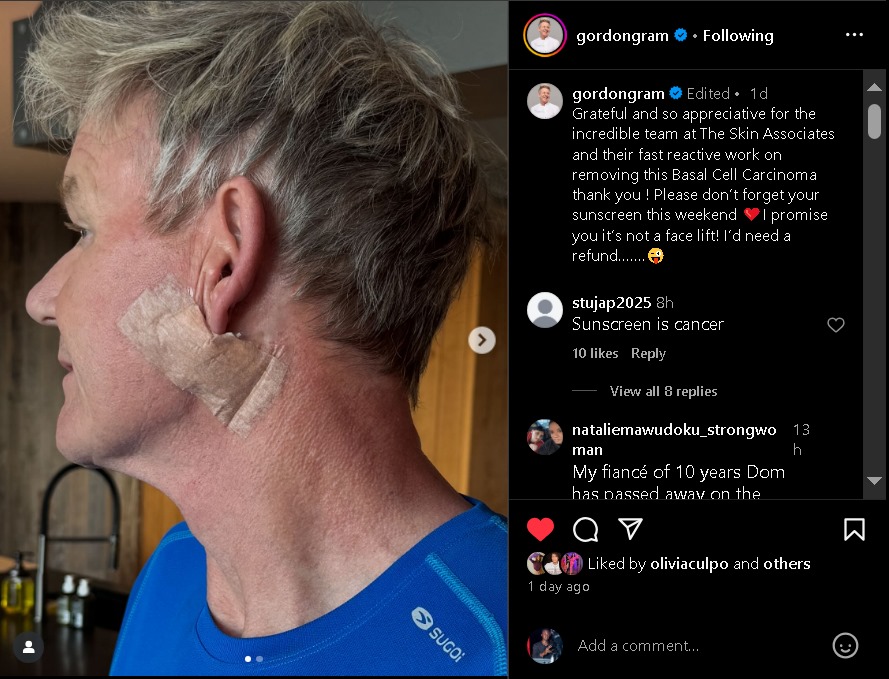 Gordon Ramsay is sharing details about his health struggles. The British celebrity chef revealed that he just had a skin cancer treatment, along with two pictures that show a line of sutures from the bottom of his ear to his chin, which he later covered with a bandage.