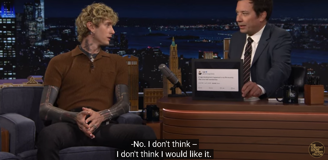 "I feel like me and him always talk about, like, 'Won't it be great to just be walking our babies down in strollers?'" MGK was featured on The Tonight Show Starring Jimmy Fallon on August 5. "And I'm like, 'You know, I don't think Megan and Elsie are ever gonna let us.'"