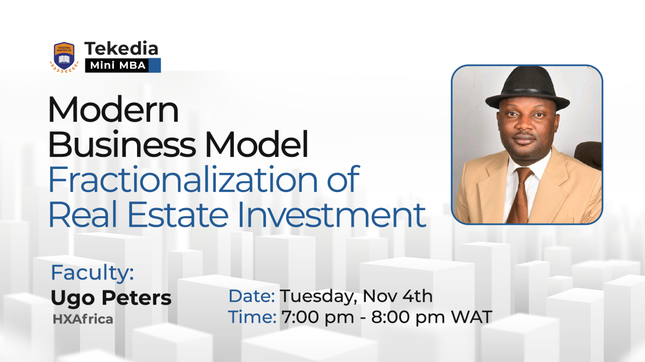 Tue, Nov 4 | 7pm-8pm WAT | Modern Business Model: Fractionalization of Real Estate Investment – Ugo Peters, HXAfrica | Zoom link