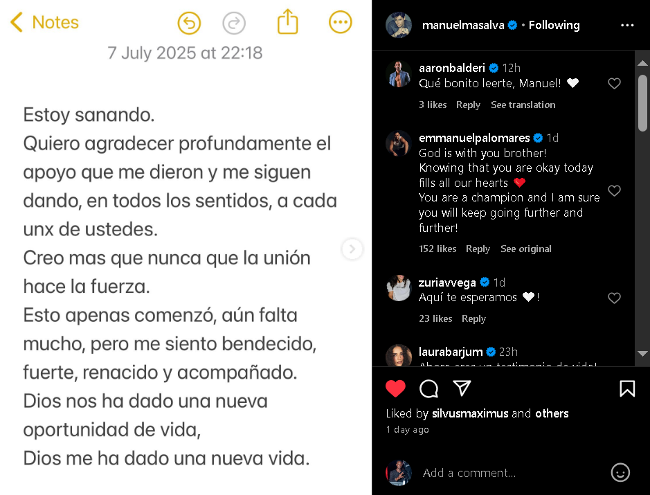 He posted a Spanish-translated message on Instagram on July 7 that read, "I am healing." "I want to profoundly thank you all for the support you have given me and continue to give me, in every sense, every one of you."