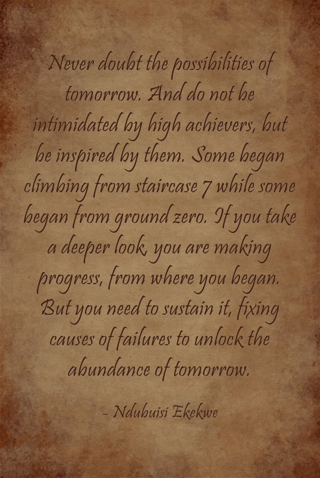 Never doubt the possibilities of tomorrow. And do not be intimidated by high achievers, but be inspired by them. Some began climbing from staircase 7 while some began from ground zero. If you take a deeper look, you are making progress, from where you began. But you need to sustain it, fixing causes of failures to unlock the abundance of tomorrow. Have a great week ahead.