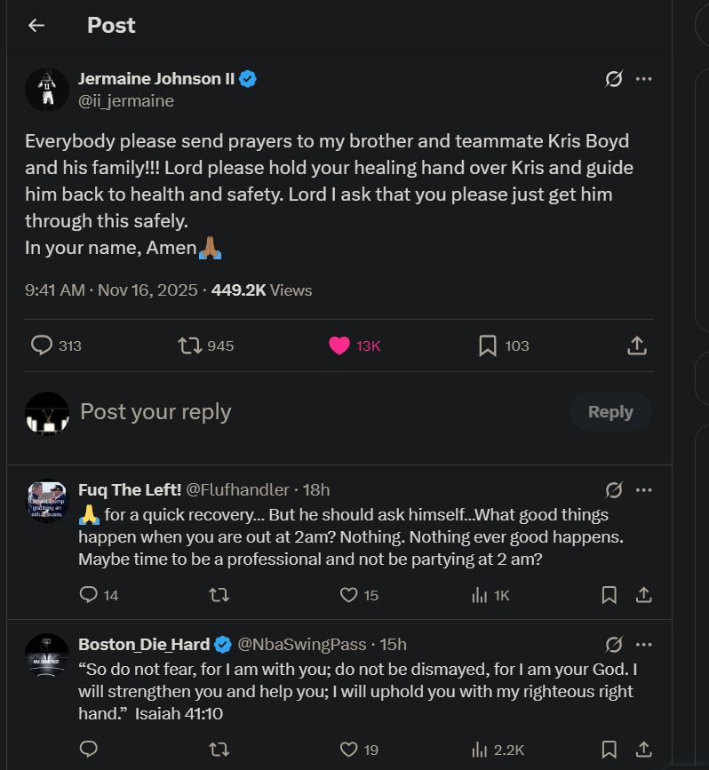 “Everybody please send prayers to my brother and teammate Kris Boyd and his family,” in a post on X (previously Twitter), the linebacker stated. “Lord please hold your healing hand over Kris and guide him back to health and safety. Lord, I ask that you please just get him through this safely. In your name, Amen.”