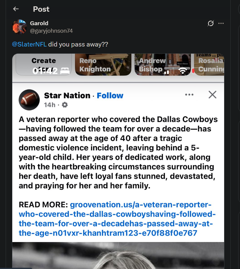 Regarding the item from the Star Nation Facebook page, it is still active and has a black-and-white picture of the Cowboys reporter along with the words "Breaking News 1980 - 2025."