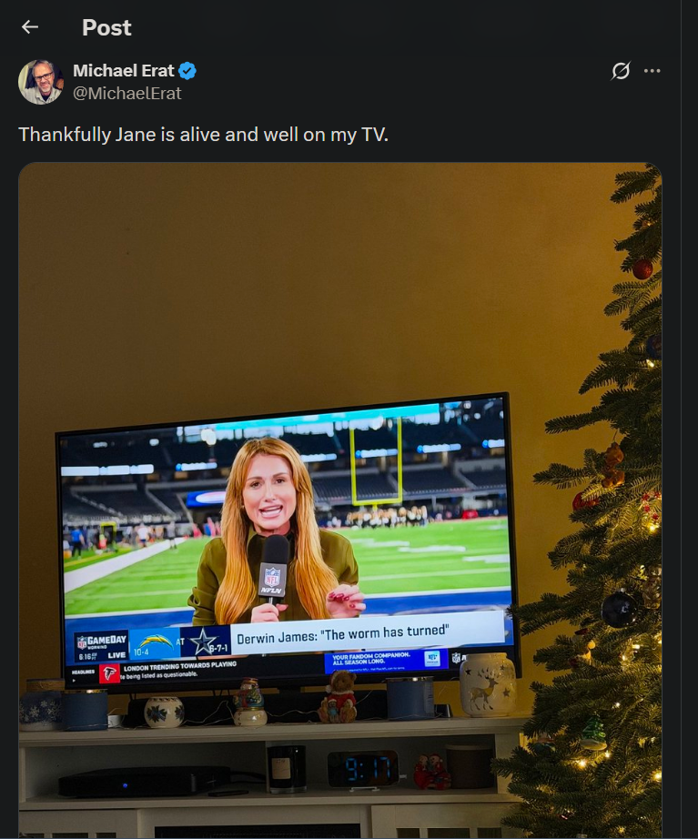 With the caption, "Thankfully Jane is alive and well on my TV," someone else posted a screenshot of the 45-year-old reporting from a football field.