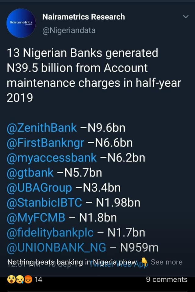 Quote from Ndubuisi Ekekwe on September 12, 2019, 5:43 PMAccount maintenance fee is the biggest innovation in Nigerian banking. In America, they pay you for the privilege of serving you (yes, when you open an account, most U.S. banks have reward promotions that can pay up to $500 for doing that). But in Nigeria, banks legally leak your balance. It is only in Nigeria where banks declare big profits in a fluttering economy. The total market cap for Unity Bank is N7.8B; Zenith Bank makes N9.6B in 6 months.