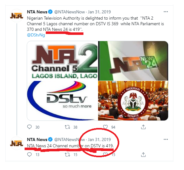 Let us smile this Saturday evening: NTA News 24 is “419” on DSTV. Walahi!! MultiChoice is on top of branding in Nigeria. Who wants to watch that 419 channel? People, it seems even NTA cannot read contexts these days. Very surprised that no one followed up with DSTV to change it. But do not make it 666 though if you want to help.