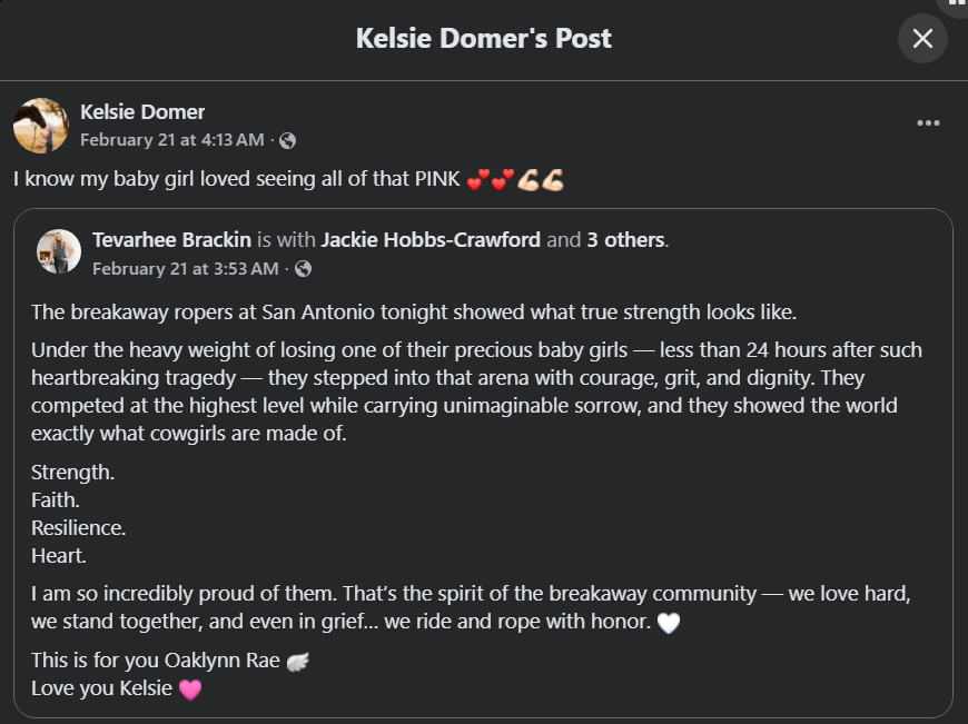 Breakaway ropers honored Oaklynn by dressing in pink during a San Antonio event on February 20. An attendee's experience was recounted by Kelsie, who noted, "I know my baby girl loved seeing all of that PINK."