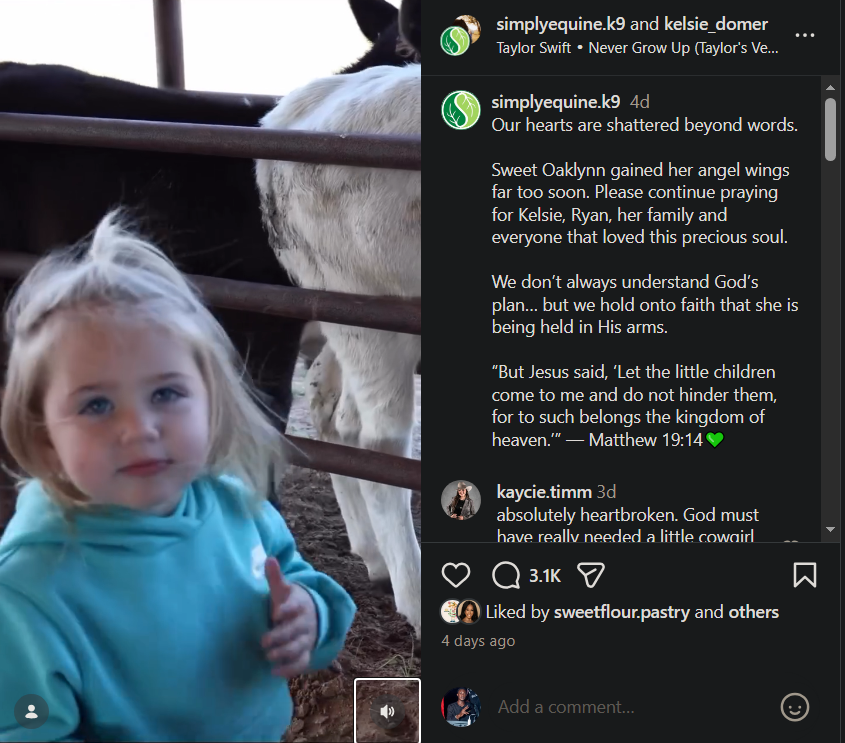 Oaklynn, the 3-year-old daughter of rodeo champion Kelsie Domer, passes away following a horse accident.