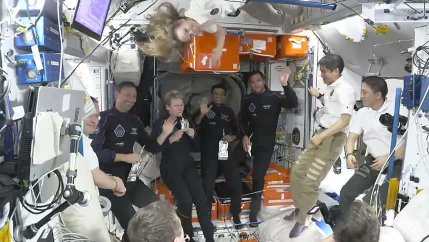 The crew celebrated with handshakes, hugs, and a traditional ISS toast — drink pouches sipped through straws floating in microgravity. With this arrival, six countries are now simultaneously represented on the ISS: the United States, Russia, Japan, India, Poland, and Hungary.
