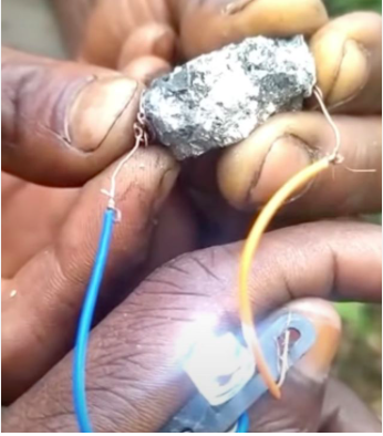 As proof, social media users shared a video showing several people inspecting a small, shiny rock. One of the individuals connects two ends of what appears to be a wire to the rock, which activates a light on the wire.