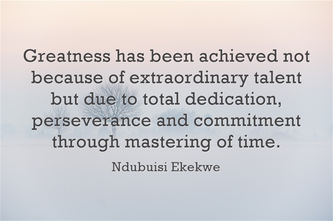 Greatness has been achieved not because of extraordinary talent but due to total dedication, perseverance and commitment through mastering of time - Ndubuisi Ekekwe