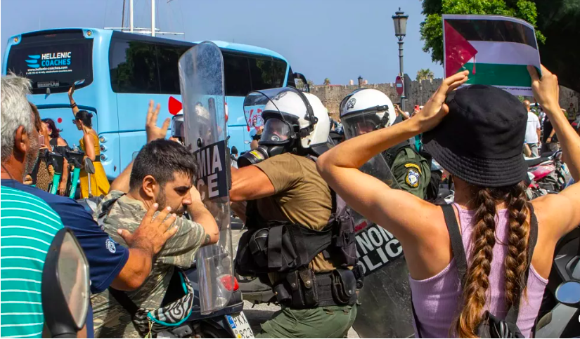 Scuffles broke out between riot police and anti-war demonstrators on Rhodes during the visit of an Israeli cruise ship amid rising tensions over the war in Gaza