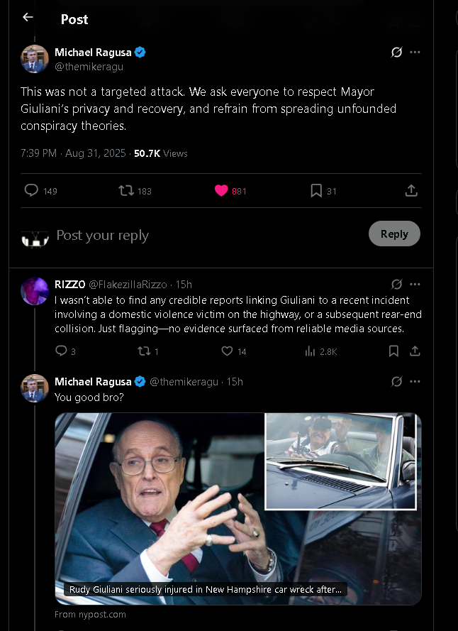 “He remained on scene until responding officers arrived to ensure her safety,” the statement went on. “Following this, while traveling on the highway, Mayor Giuliani’s vehicle was struck from behind at a high speed.”