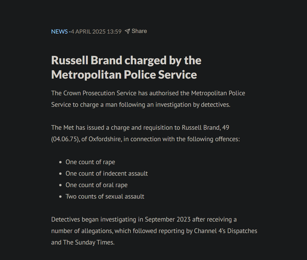 Brand quickly refuted the allegations on social media, stating in an X video at the time, “I was a drug addict, a sex addict and an imbecile, but what I never was, was a rapist.”