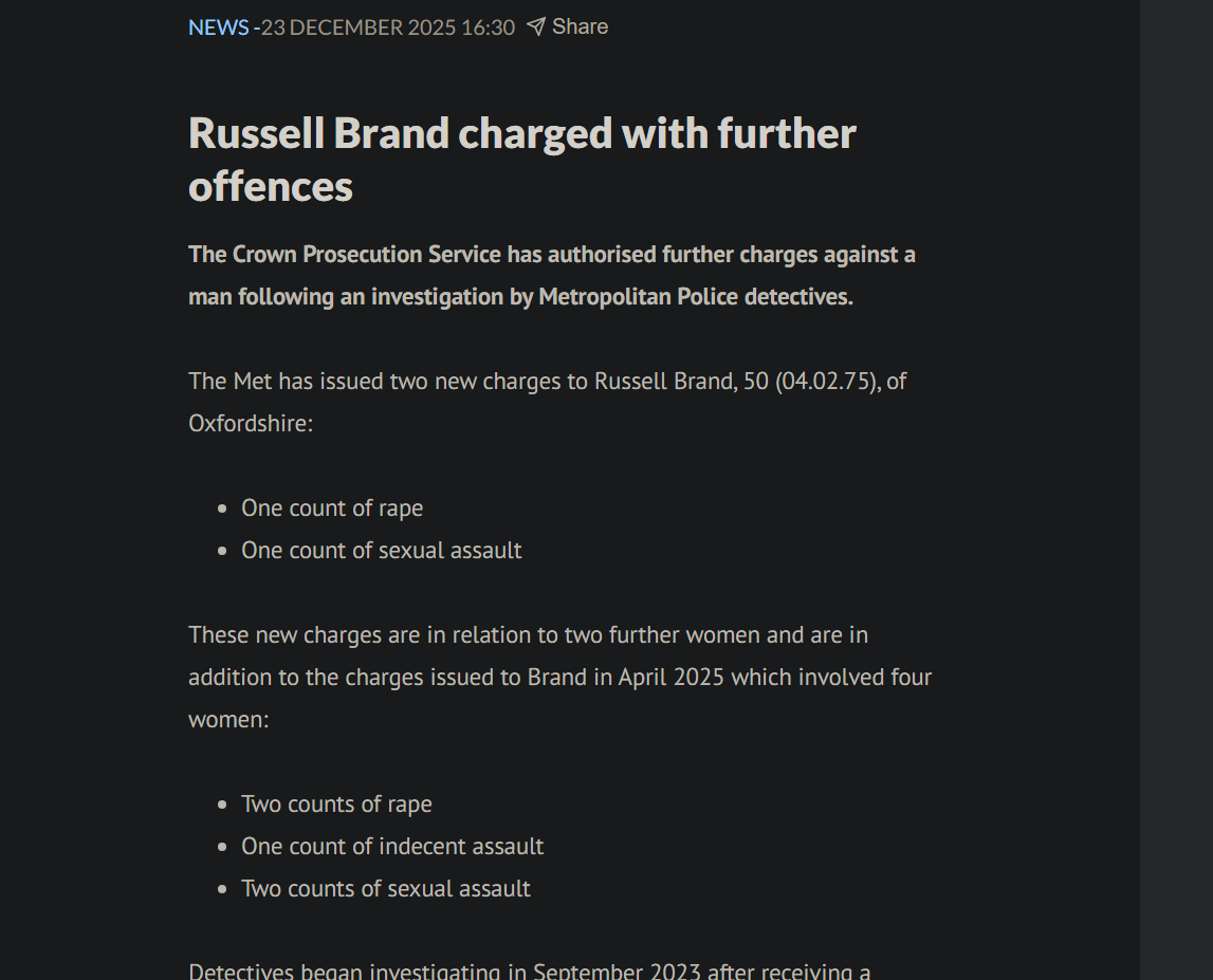 London's Metropolitan Police department announced in a news release on December 23 that Brand was charged with one more count of rape and one additional count of sexual assault pertaining to the two victims. On January 20, 2026, a London court is scheduled to hear the charges against him.
