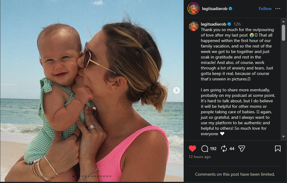 Sadie noted that the event occurred "within the first hour" of their family vacation and expressed her gratitude to her followers for their love and support after sharing her story.