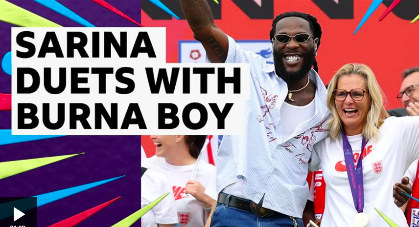 England manager Sarina Wiegman was stunned when Burna Boy surprised her on stage at the Lionesses’ Euro 2025 victory celebration, creating an unforgettable mix of football, music, and pure joy.