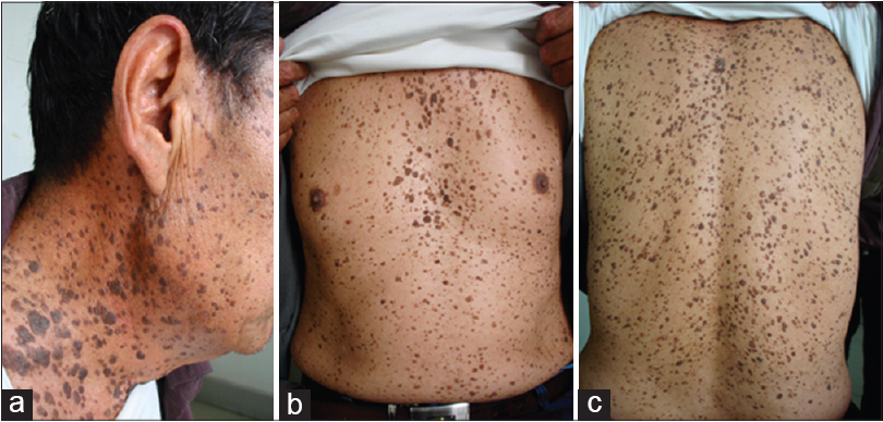 - Skin tags: Small, flesh-colored or slightly darker growths that hang off the skin.