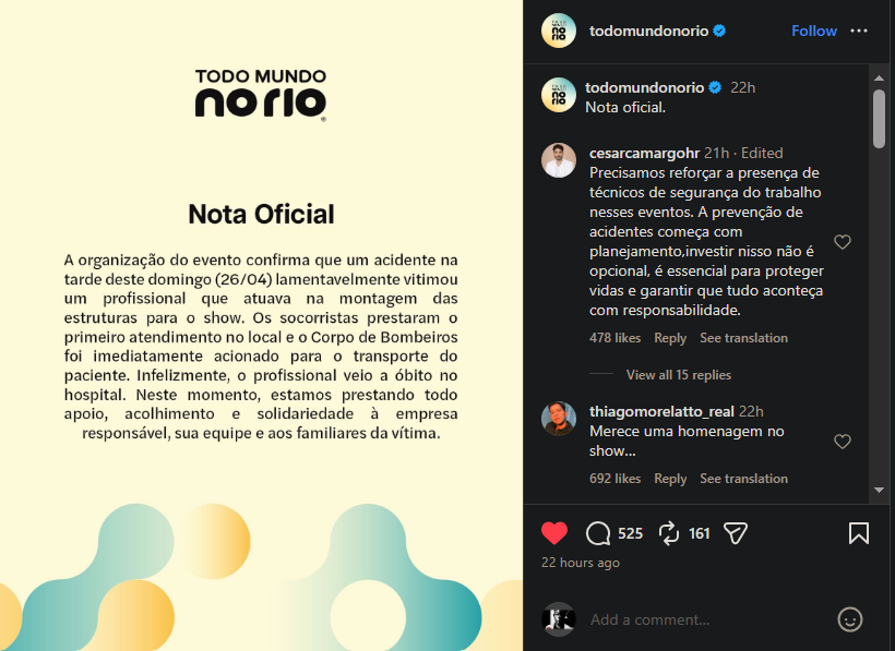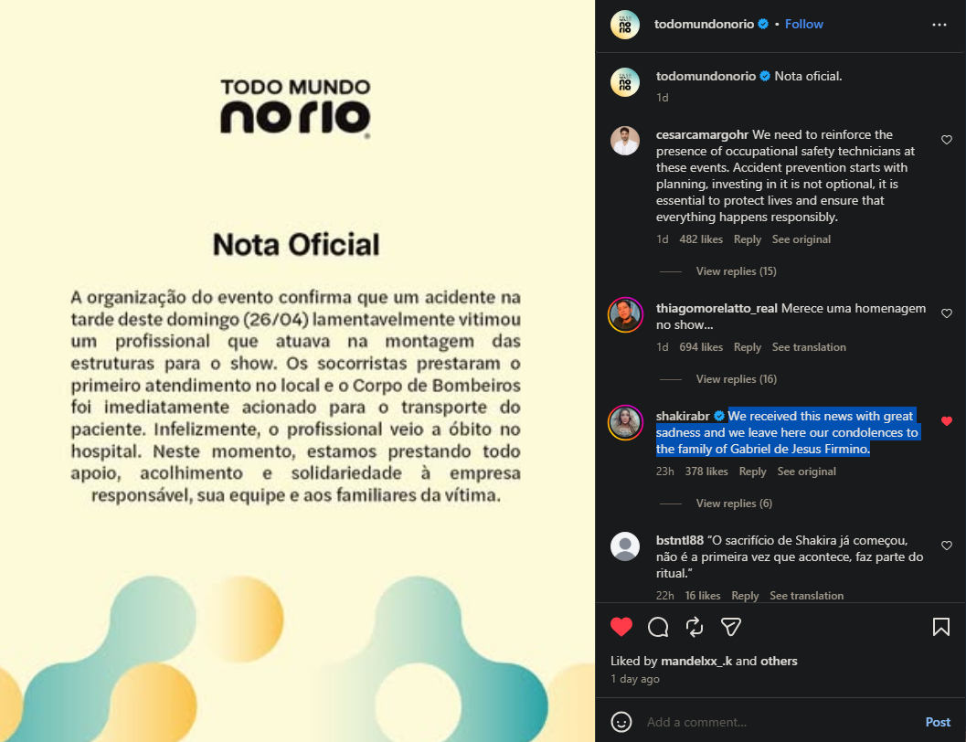 A life has been lost in an awful incident. A construction worker who had been working on creating the stage perished in an accident on April 26 before to Shakira's May 2 "Todo Mundo No Rio" concert in Rio, Brazil, according to a social media announcement from the event organizers.