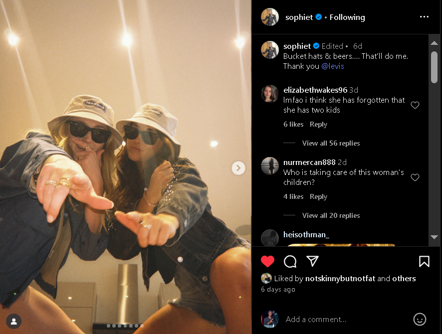 Under Sophie's August 4 Instagram post, a commenter commented, "Lmfao," saying, “I think she has forgotten that she has two kids.”