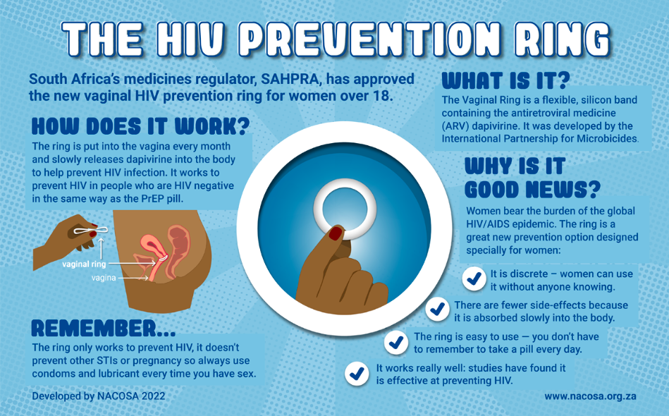 Women bear a disproportionate burden of the global HIV/AIDS epidemic, with nearly two‐thirds of new adult infections in South Africa occurring among women. The ring is a great new prevention option designed specifically for women.