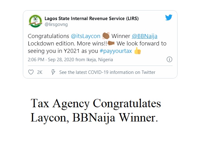 Tax Agency Congratulates Laycon, BBNaija Winner