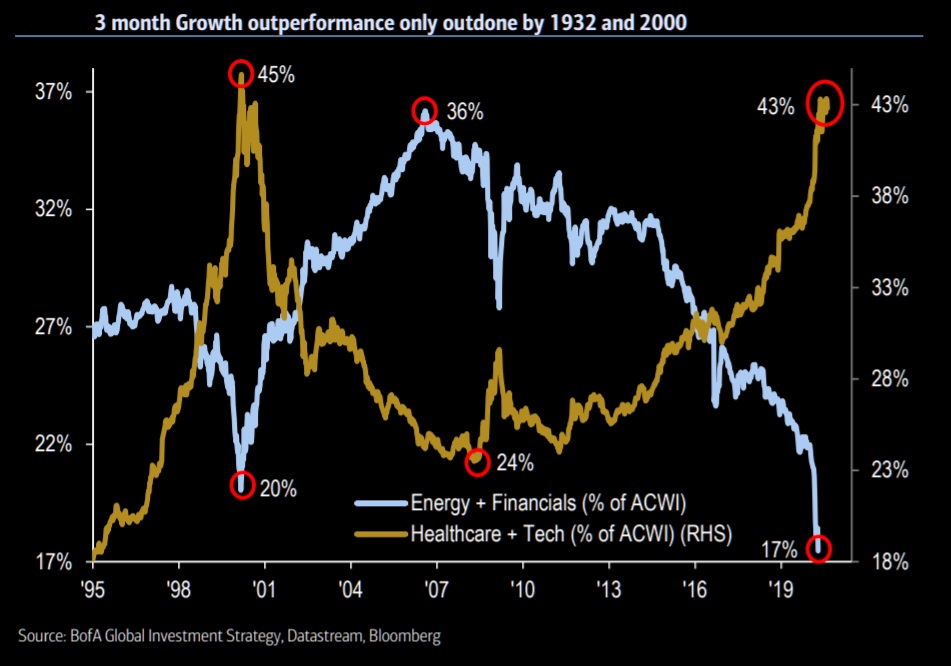 This is indeed the age of technology. From this plot, the technology sector, biased with healthcare, continues to dominate, well ahead of energy and financial sectors. Of course, this is not what we have in developing economies like Nigeria. We never really have an energy sector since our participation is largely at the downstream level.