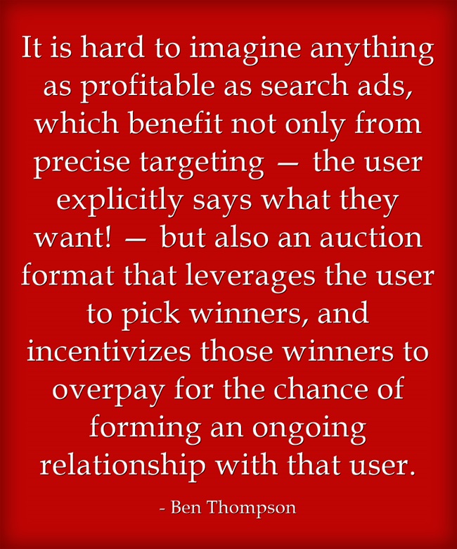"It is hard to imagine anything as profitable as search ads, which benefit not only from precise targeting — the user explicitly says what they want! — but also an auction format that leverages the user to pick winners, and incentivizes those winners to overpay for the chance of forming an ongoing relationship with that user" Ben Thompson