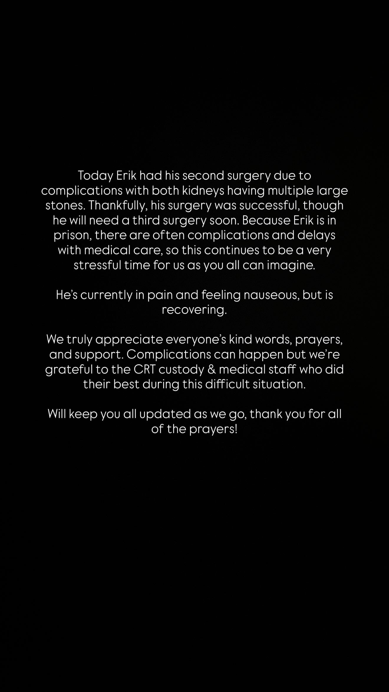 “Because Erik is in prison, there are often complications and delays in medical care,” Talia, 29, went on, “so this continues to be a very stressful time for us all as you can imagine.” Nevertheless, she pointed out that her father's health was already getting better.