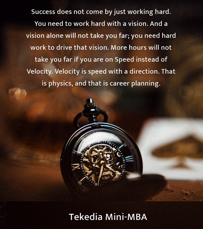 Success does not come by just working hard. You need to work hard with a vision. And a vision alone will not take you far; you need hard work to drive that vision. More hours will not take you far if you are on Speed instead of Velocity. Velocity is speed with a direction. That is physics, and that is career planning.